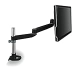 Monitor arm provides 7 1/2 in of height adjustability and extends 19 1/2 in from the base. Monitor can rotate from landscape to portrait for optimal viewing. Clamp mount hardware fits desks up to 4 1/4 in thick and grommet mount hardware fits desks up to 2 1/4 in thick. Weight capacity of 30 lbs. VESA MIS-D Compliant.